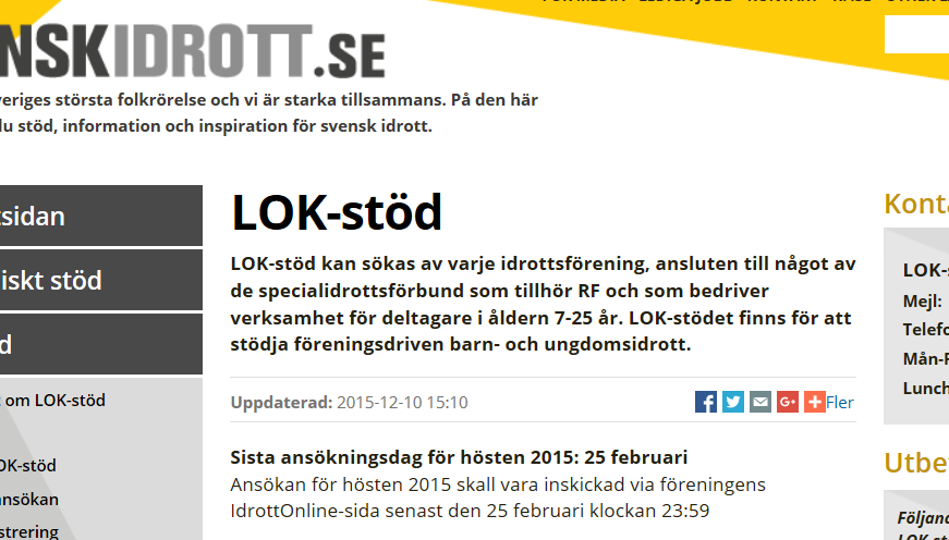 Nu är det snart dags att lämna in LOK stödet och när ni är klara så rapportera till Lars Åke att detta är klar (några har gjort detta). Senaste dagen är 31 januari 2016 så vi har tid att sammaställa. OBS!! Kommunalt aktivitetstöd så är reglerna att det räcker med EN deltagare samt en ledare. Några frågor så ta kontakt med Lars Åke på mobilnummer 0706586687